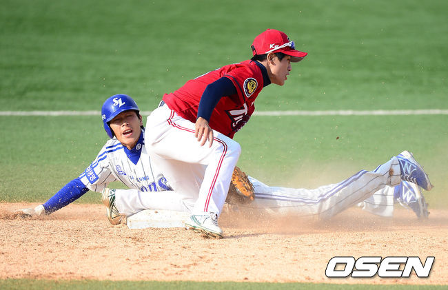 30일 오후 대구 시민구장에서 열린 '2014 한국야쿠르트 세븐 프로야구' 삼성 라이온즈와 KIA 타이거즈의 경기, 7회말 무사 주자 1루 삼성 박석민 타석에서 1루 주자 박찬도가 2루 도루에 성공하고 있다.