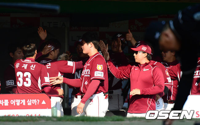 8회초 무사 1,2루에서 넥센 강정호의 좌전 적시타 때 홈을 밟은 2루주자 이택근이 더그아웃에서 동료들과 하이파이브를 하고 있다.