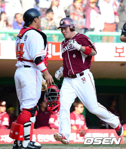 8회초 무사 1,2루에서 넥센 김민성의 좌전 적시타 때 2루주자 박병호가 득점에 성공하고 있다.