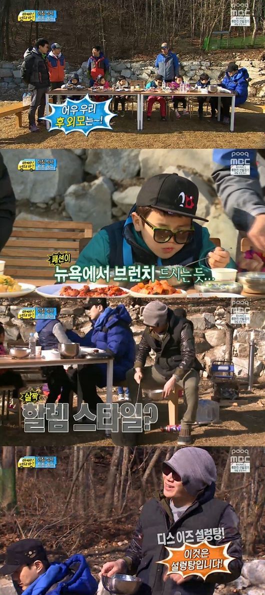 30일 방송된 MBC 예능프로그램 ‘일밤-아빠 어디가’에서는 아침 식사로 설렁탕을 먹는 멤버들의 모습이 그려졌다. 윤민수와 윤후는 남들과 다르게 의상을 곱게 차려 입고 선글라스까지 낀 채 설렁탕을 먹었다.
