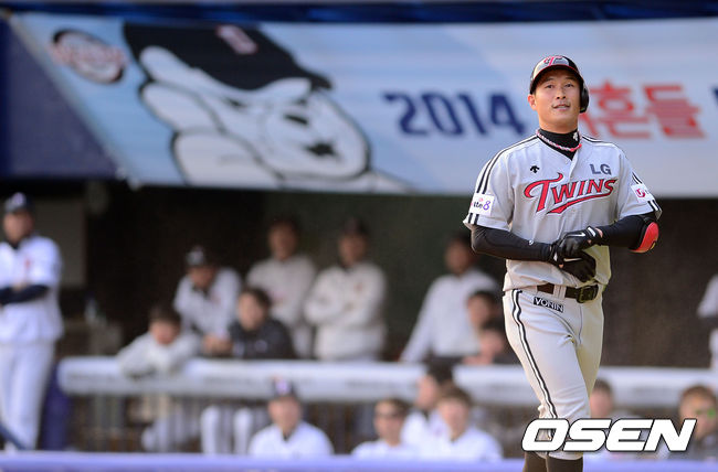 30일 오후 서울 잠실구장에서 열린 '2014 한국야쿠르트 세븐 프로야구' 두산 베어스와 LG 트윈스의 경기,8회초 1사 3루 LG 임재철이 희생타를 날리고 더그아웃으로 들어가고 있다. 임재철은 두산에서 코치직을 제의받았지만 선수 생활을 택하며 LG로 이적 됐다.