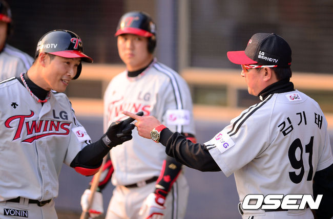 30일 오후 서울 잠실구장에서 열린 '2014 한국야쿠르트 세븐 프로야구' 두산 베어스와 LG 트윈스의 경기,8회초 1사 3루 LG 임재철이 희생타를 날리고 김기태 감독과 하이파이브를 하고 있다. 임재철은 두산에서 코치직을 제의받았지만 선수 생활을 택하며 LG로 이적 됐다.