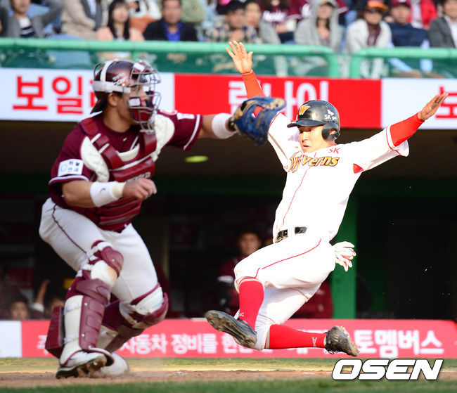 8회말 2사 1,2루에서 SK 조인성의 역전 적시타 때 2루주자 나주환이 득점에 성공하고 있다./sunday@osen.co.kr
