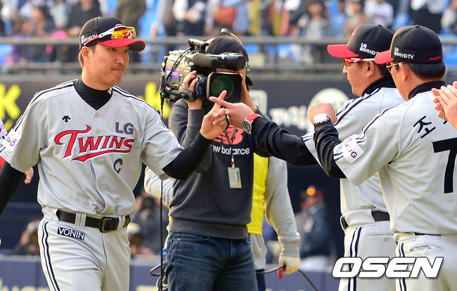 이진영-김기태,'승리의 손가락 하이파이브'