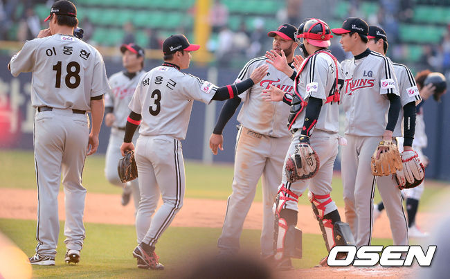 경기종료 후 LG 선수들이 승리의 기쁨을 나누고 있다.