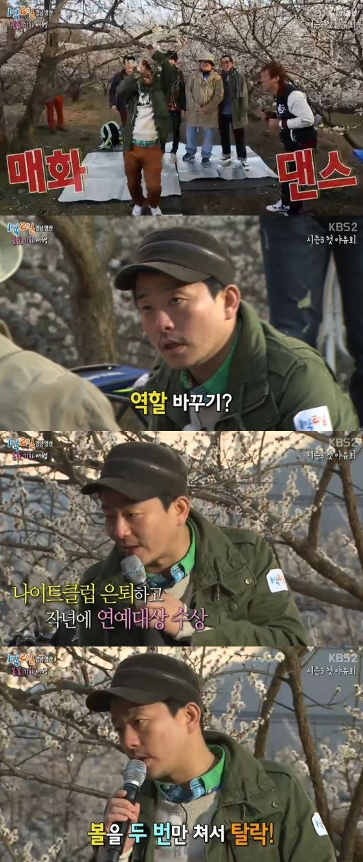 이날 김주혁 차태현 데프콘 정준영은 아직 도착하지 않은 김종민, 김준호를 제외하고 롯데자이언츠 응원단장인 조지훈과 함께 야유회를 즐겼다.