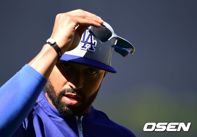 경기에 앞서 멧 켐프가 그라운드에서 훈련을 마치고 더그아웃으로 향하고 있다.