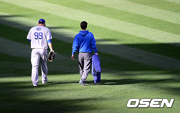 경기에 앞서 다저스 류현진이 외야에서 몸을 풀고 있다.