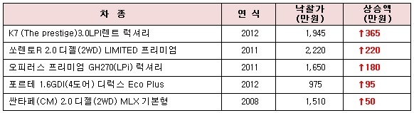 총 출품 차량은 637대로 이 중 380대가 낙찰됐으며 출품자의 희망가 대비 낙찰가가 상승한 주요 차량은 표와 같다.