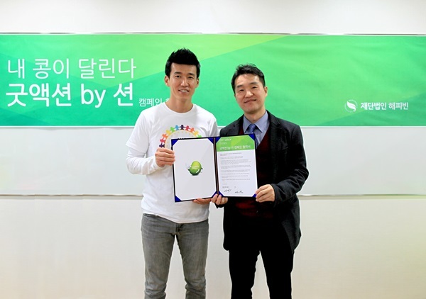 '선행천사' 션과 재단법인 해피빈이 온라인 기부 문화 확산을 위해 '내 콩이 달린다! 굿액션 by 션'캠페인 협약식을 가졌다.