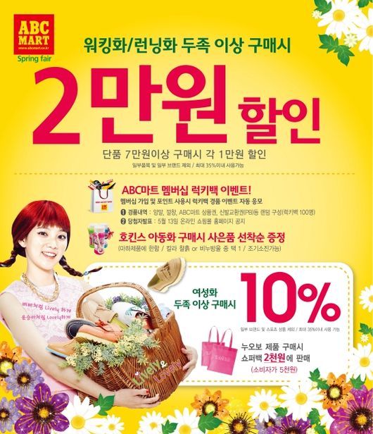해당 이벤트는 오는 4월 27일까지 진행되며, 행사 기간 동안 ABC마트의 레이디스 캐쥬얼 여성화 2켤레를 구매하면 금액 10%를 할인해준다. 또, 최근 윤승아가 모델로 활약 중인 누오보(NUOVO) 제품을 구매하면 5000원에 판매 중인 패션 부직포 백을 2000원으로 다운된 가격에 구매할 수 있다.