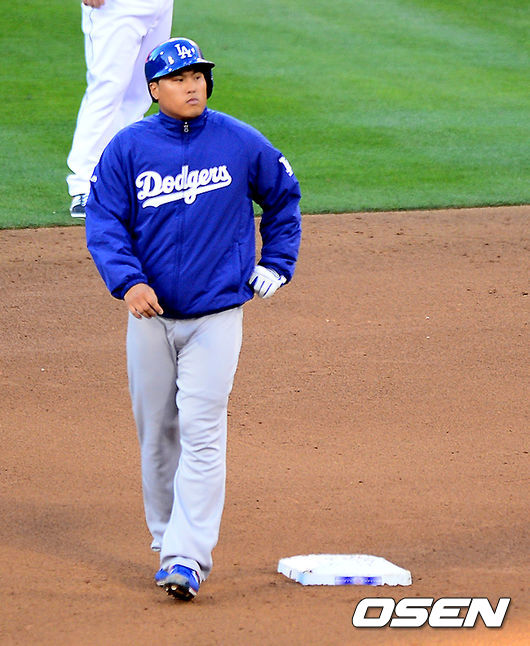5회초 1사 1,2루에서 다저스 류현진이 크로포드의 1타점 적시타에 2루에 출루하고 있다.