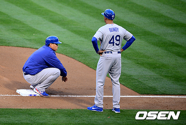 5회초 3루까지 진루한 다저스 류현진이 잠시 베이스에 앉아 휴식을 취하고 있다.