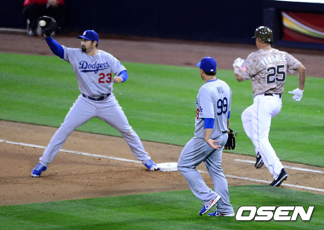 7회말 1사 1루에서 다저스 류현진이 파드리스 베너블을 1루땅볼 병살로 처리하고 있다.