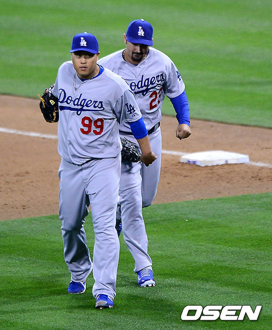 7회말 1사 1루에서 다저스 류현진이 파드리스 베너블을 1루땅볼 병살로 처리하고 곤잘레스와 기뻐하고 있다.