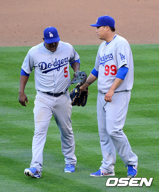 다저스 유리베가 류현진을 격려하고 있다./ jpnews@osen.co.kr