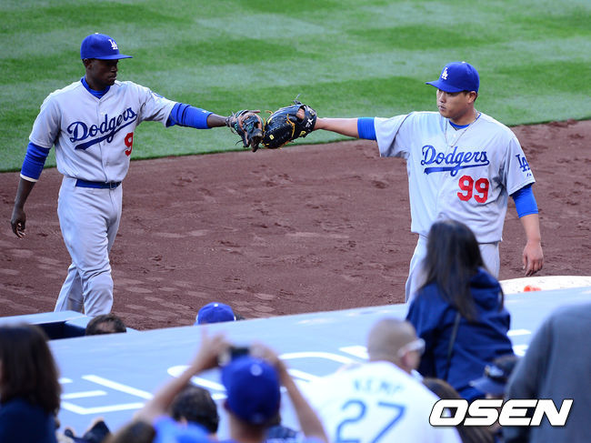 3회말 수비를 마치고 다저스 류현진이 고든과 하이파이브를 하고 있다./ jpnews@osen.co.kr