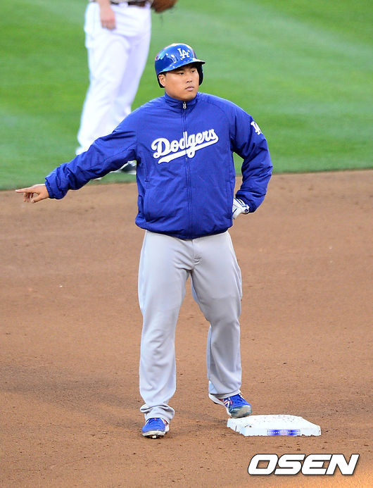 5회초 2사 1,2루에서 다저스 크로포드의 선제 적시타에 류현진이 2루에 진루하고 있다./ jpnews@osen.co.kr