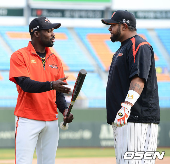 31일 오후 부산 사직구장에서 열리는 '2014 한국야쿠르트 세븐 프로야구' 롯데 자이언츠와 한화 이글스의 경기 시작전 피에와 히메네스가 이야기를 나누고 있다.