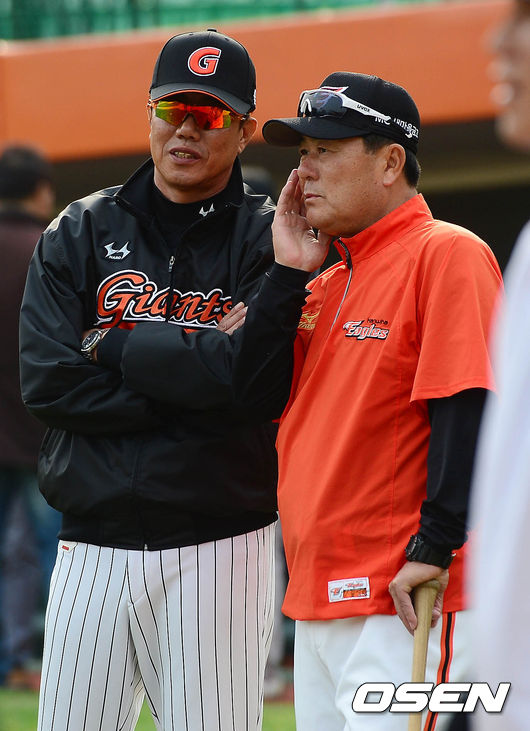 31일 오후 부산 사직구장에서 열리는 '2014 한국야쿠르트 세븐 프로야구' 롯데 자이언츠와 한화 이글스의 경기 시작전 김시진 감독과 한화 김성한 수석코치가 이야기를 나누고 있다.