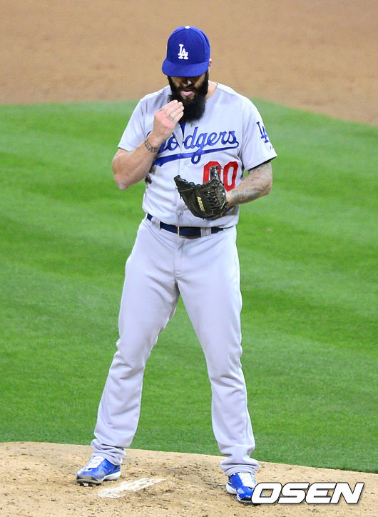 8회말 마운드에 오른 브라이언 윌슨이 동점 홈런을 맞고 아쉬워 하고 있다. 브라이언 윌슨은 8회 등판해 아웃카운트를 하나도 못잡으며 패전투수가 됐다.