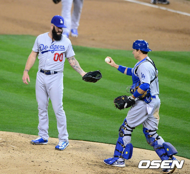 8회말 마운드에 오른 브라이언 윌슨이 역전 점수를 내주자 A.J 엘리스가 마운드에 오르고 있다. 브라이언 윌슨은 8회 등판해 아웃카운트를 하나도 못잡으며 패전투수가 됐다.