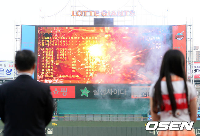 31일 오후 부산 사직구장에서 열린 '2014 한국야쿠르트 세븐 프로야구' 롯데 자이언츠와 한화 이글스의 경기 시작전 사직구장의 새 전광판 점등식이 열리고 있다.