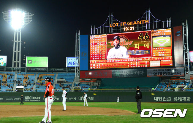 31일 오후 부산 사직구장에서 '2014 한국야쿠르트 세븐 프로야구' 롯데 자이언츠와 한화 이글스의 경기가 열렸다. 사진은 롯데가 총 39억원을 들여 올해 새롭게 리모델링한 미국 닥트로닉스社의 전광판. FULL HD급 영상으로 미국 메이저리그 30개 구장 중 28개 구장이 사용하고 있다. 크기는 기존 전광판 보다 1.7배 커졌다.