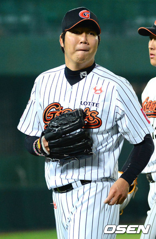 31일 오후 부산 사직구장에서 열린 '2014 한국야쿠르트 세븐 프로야구' 롯데 자이언츠와 한화 이글스의 경기 5회말을 마친 장원준이 덕아웃으로 향하고 있다.