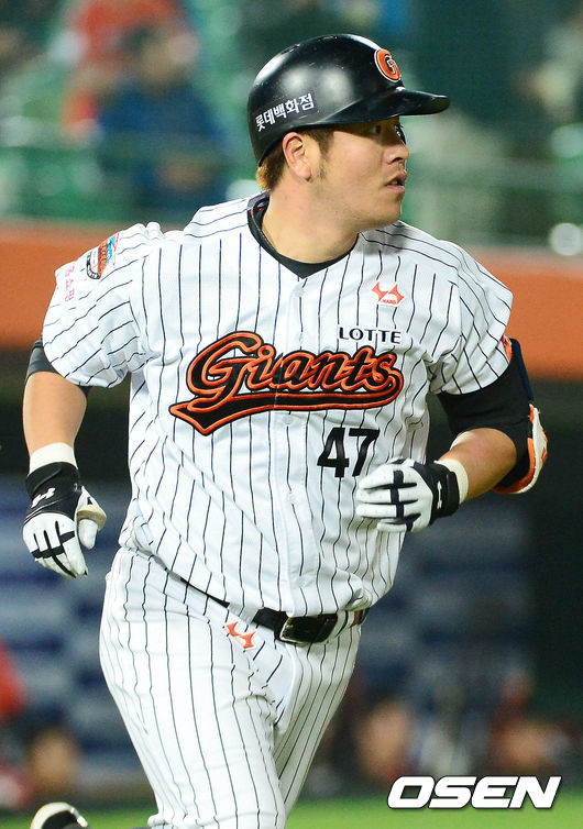 31일 오후 부산 사직구장에서 열린 '2014 한국야쿠르트 세븐 프로야구' 롯데 자이언츠와 한화 이글스의 경기 6회말 무사 1루 강민호가 투런포를 치고 달리고 있다.