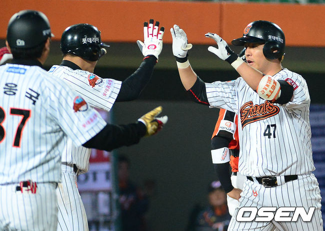 31일 오후 부산 사직구장에서 열린 '2014 한국야쿠르트 세븐 프로야구' 롯데 자이언츠와 한화 이글스의 경기 6회말 무사 1루 강민호가 동점 투런포를 치고 홈에서 박종윤과 하이파이브를 하고 있다.