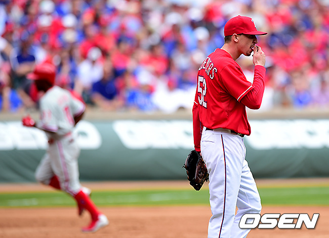 2회초 2사 만루에서 텍사스 테너 쉐퍼스가 필라델피아 롤린스에 만루포를 허용하고 아쉬워하고 있다./ jpnews@osen.co.kr