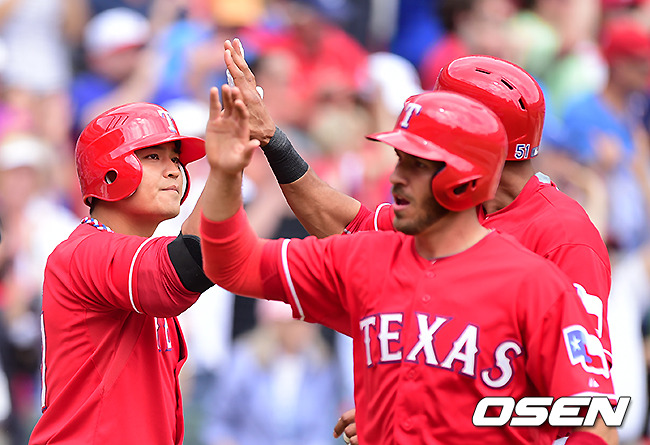 2회말 1사 만루 텍사스 조쉬의 3타점 적시 2루타에 추신수가 동료선수들과 하이파이브를 하고 있다./ jpnews@osen.co.kr