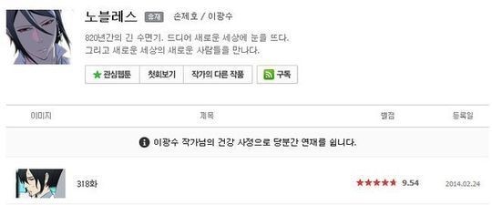 그러나 '노블레스'는 지난 2월 24일 318화를 끝으로 더 이상 업데이트되지 않고 있다. 이에 네이버측은 '이광수 작가님의 건강 사정으로 당분간 연재를 쉽니다'라고 밝혔다.
