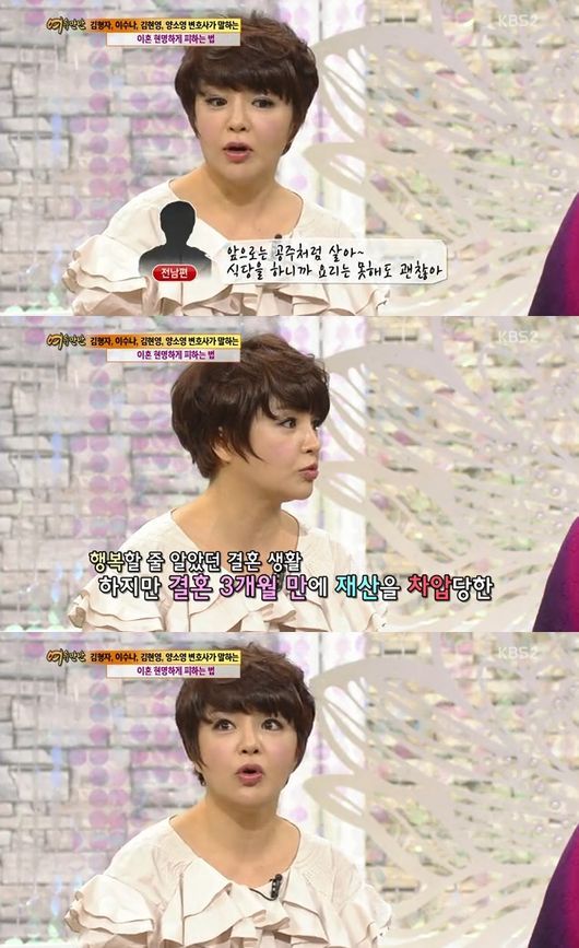 1일 방송된 KBS 2TV ‘여유만만’에서는 ‘이혼 현명하게 피하는 법’을 주제로 배우 김형자, 이수나, 김현영과 양소영 변호사가 출연했다.