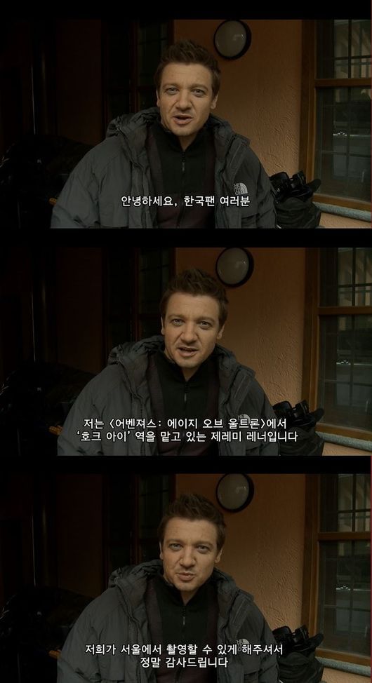 그는 영상을 통해 "안녕하세요. 한국 팬 여러분. 저는 '어벤져스: 에이지 오브 울트론'에서 '호크 아이' 역을 맡고 있는 제레미 레너입니다. 저희가 서울에서 촬영할 수 있게 해주셔서 정말 감사 드립니다"라며 조만간 멋진 작품으로 만나 뵙게 될 수 있기를 기대하겠습니다"라고 전했다.