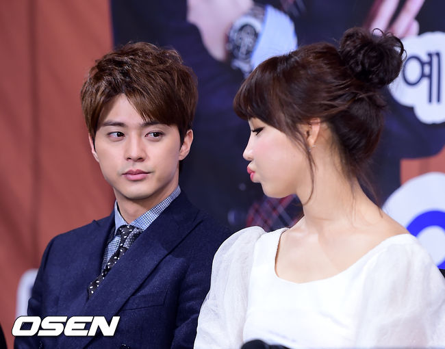 1일 오후 서울 중구 장충동2가 반얀트리 클럽 앤 스파 서울 크리스탈볼룸에서 열린 MBC 주말드라마 '왔다 장보리' 제작발표회, 김지훈이 이유리를 바라보고 있다.
