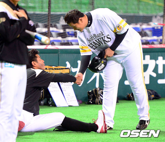 1일 오후 일본 후쿠오카 야후오크돔에서 열리는 소프트뱅크 호스크와 니혼햄 파이터스의 경기에 앞서 소프트뱅크 이대호가 니혼햄 선수와 악수를 나누고 있다.