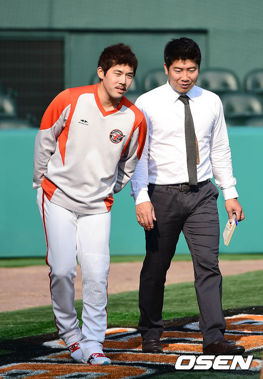 경기에 앞서 한화 이용규와 박재홍 MBC스포츠플러스 해설위원이 이야기를 나누고 있다.