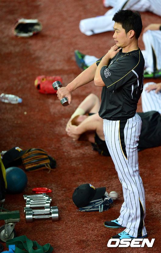 '끝판대장' 오승환이 1일 오후 일본 오사카 교세라돔에서 열리는 '2014 일본프로야구' 한신 타이거스 대 주니치 드래건스의 경기를 앞두고 외야에서 훈련을 하고 있다.