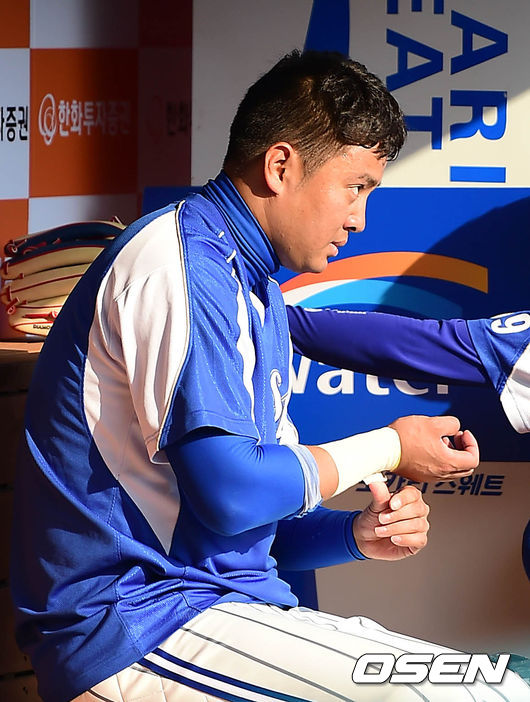 경기에 앞서 삼성 채태인이 손목에 테이핑을 하고 있다.