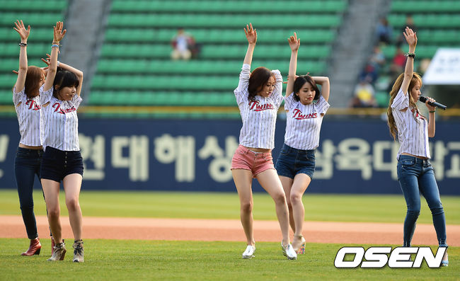1일 오후 잠실구장서 열린 '2014 한국야쿠르트 세븐 프로야구' LG 트윈스와 SK 와이번스의 홈 개막전, 경기 전 레이디스 코드가 그라운드 위에서 공연을 펼치고 있다.