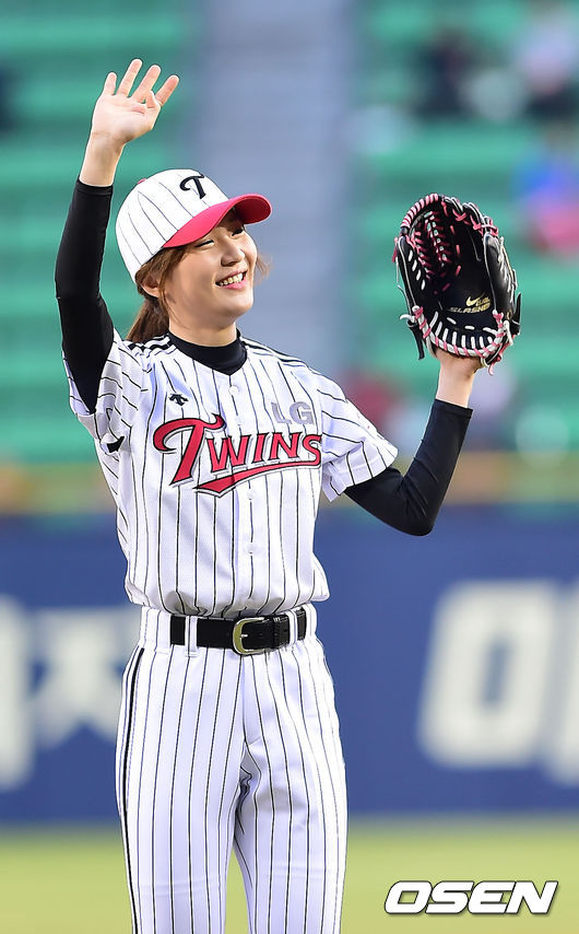 1일 오후 잠실구장서 열린 '2014 한국야쿠르트 세븐 프로야구' LG 트윈스와 SK 와이번스의 홈 개막전, 경기 전 2014 소치 동계올림픽 쇼트트랙 2관왕에 빛나는 박승희가 시구를 한 후 손을 흔들고 있다.