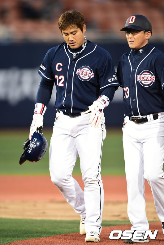 1일 목동야구장에서 벌어진 '2014 한국야쿠르트 세븐 프로야구' 넥센 히어로즈와 두산 베어스의 경기 2회초 무사 1루 안타를 치고 나간 홍성흔이 이원석의 타구에 맞아 아웃된 후 괴로워 하고 있다.