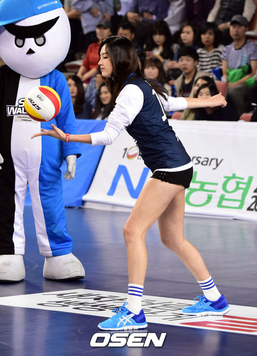 1일 오후 충남 천안시 천안유관순체육관서 열린 NH농협 2013~2014 V-리그 남자부 챔피언결정전 3차전 현대캐피탈과 삼성화재의 경기 방송인 리아가 시구를 하고 있다