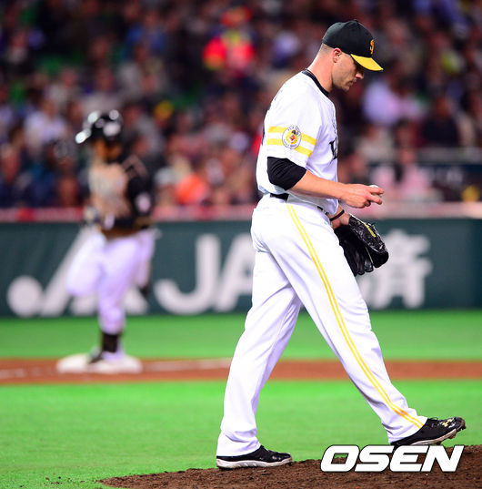 4회초 2사 소프트뱅크 제이슨 스탠드릿지가 니혼햄 오비키 게이지가 솔로 홈런을 허용한 뒤 아쉬워하고 있다.