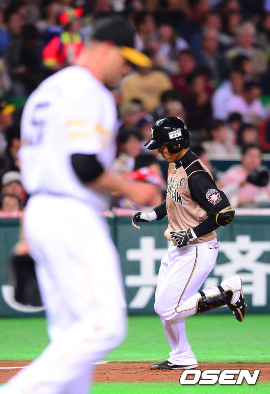 4회초 2사 니혼햄 오비키 게이지가 솔로홈런을 때린 뒤 베이스를 돌고 있다.