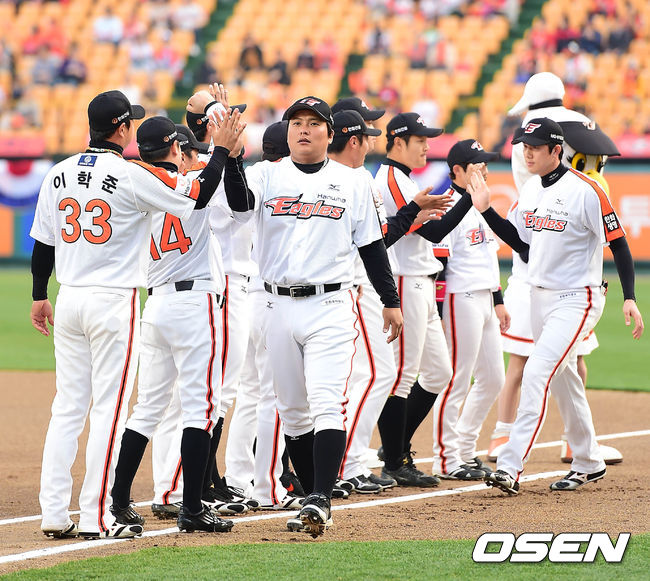 경기에 앞서 개막식 행사에서 한화 선수들이 그라운드에 입장하며 하이파이브를 하고 있다.