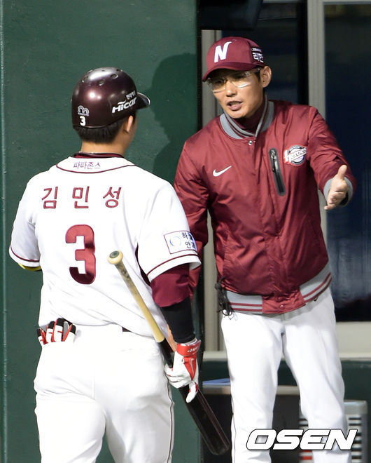 1일 목동야구장에서 벌어진 '2014 한국야쿠르트 세븐 프로야구' 넥센 히어로즈와 두산 베어스의 경기 2회말 1사 김민성이 좌월 솔로 홈런을 치고 동료들의 환영을 받고 있다.