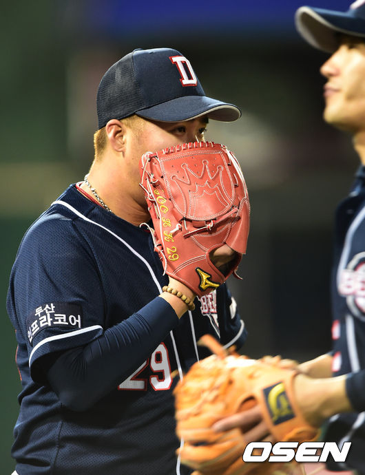 1일 목동야구장에서 벌어진 '2014 한국야쿠르트 세븐 프로야구' 넥센 히어로즈와 두산 베어스의 경기 2회말 1사 김민성에 좌월 솔로 홈런을 맞은 유희관이 이닝을 마치고 동료들과 이야기를 나누고 있다.
